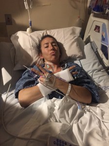 Then… I started having more pain. I know I said that there were some issues controlling my pain but this was a nine out of ten pain that was constant and unrelenting. On Saturday night, five days after surgery, I “crashed”. It started with what felt like a maximal cramp of my lowest ab muscle that wouldn’t release and then worked its way segmentally up my entire abdomen. Maybe you can imagine, maybe you can’t, but at this point I have staples from my sternum to my pelvis so having every muscle in my stomach start progressively cramping was very uncomfortable, to say the least. Then, I started shivering. I didn’t have a fever, yet, but I’ve come to recognize since, that shivering is a severe pain reaction for me. The shivering just started in my jaw but then went through my entire body to the point where I was almost convulsing and it looked like I was having a seizure. I have a feeling it was a pretty intense scene. I’m convulsing and crying in pain, my mother is crying, my dad is threatening to call 911, the nurses can’t get the doctors on the phone, and I’m in the most excruciating pain of my life. After that things get fuzzy for me. I’m told I developed a 105° temperature and then my blood pressure started dropping and my oxygen saturation started dropping. They put me on an oxygen mask with six liters of oxygen and I was barely saturating at eighty percent. I was on my way out, folks. And by out I mean, dead. I literally almost died. I feel so good now it’s crazy to think of it as anything other than a scary story or a bad dream. I remember the following day in patches. I’m told I was “in and out”. There were lots of tests. One CT scan they tried to take me to, my vitals went unstable again and they had to wheel me back to my room so I wouldn’t die during the scan. Finally, I was transferred to ICU to await surgery the next morning. I remember having this thought as I lay writhing in nine out of ten pain, “People survive torture all over the world. If this were torture, would I talk to make the pain stop?” Sometimes my answer was “No, I can do this,” and I’d grit my teeth and pray. Other times my answer was “Yes, I’d tell them whatever they wanted to know.” In surgery, they opened me back up and gave me a colostomy inserted a J tube, and two drains. Turns out because of the chemo and my weakened immune system I got c-diff which caused the anastomosis of my colon to leak and form an abscess in my abdomen and I developed severe sepsis.